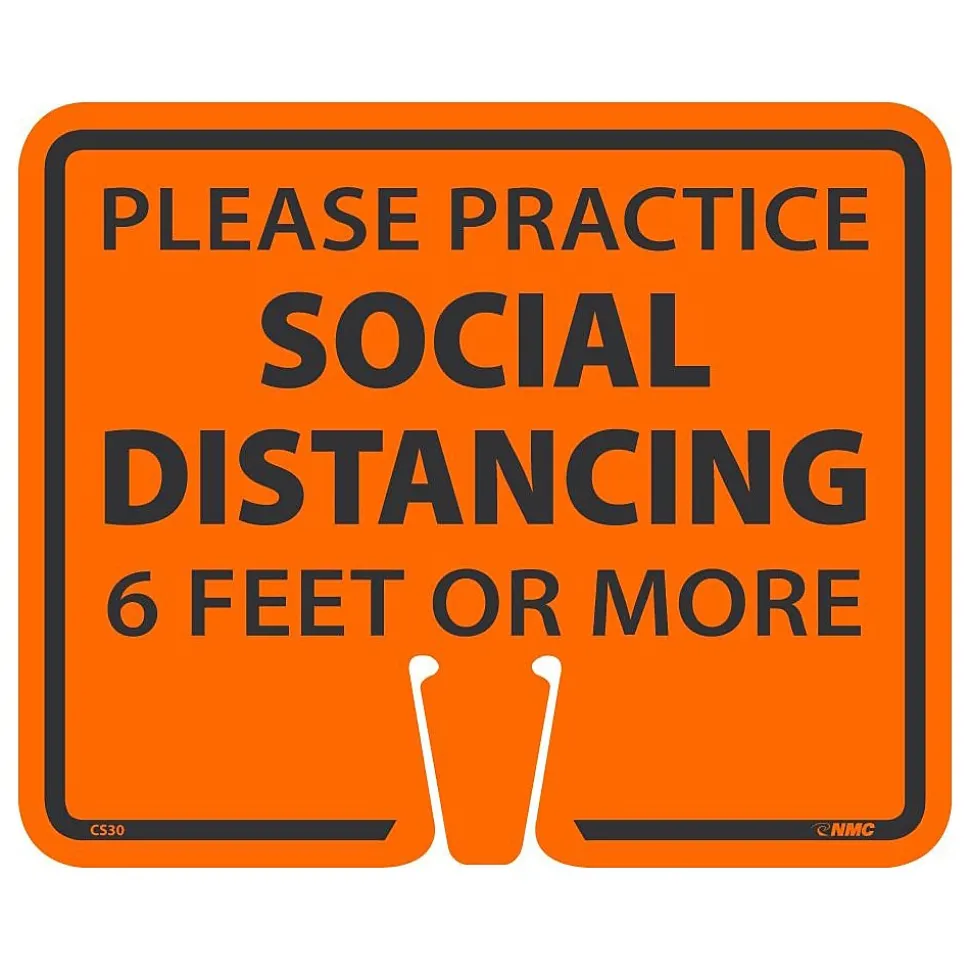 - Cone sign with the “Please Practice Social Distancing 6 Feet or More” message imprinted in English