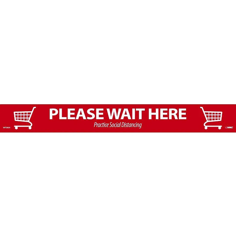 - Floor sign with “Please Wait Here. Practice social distancing” message imprinted in English