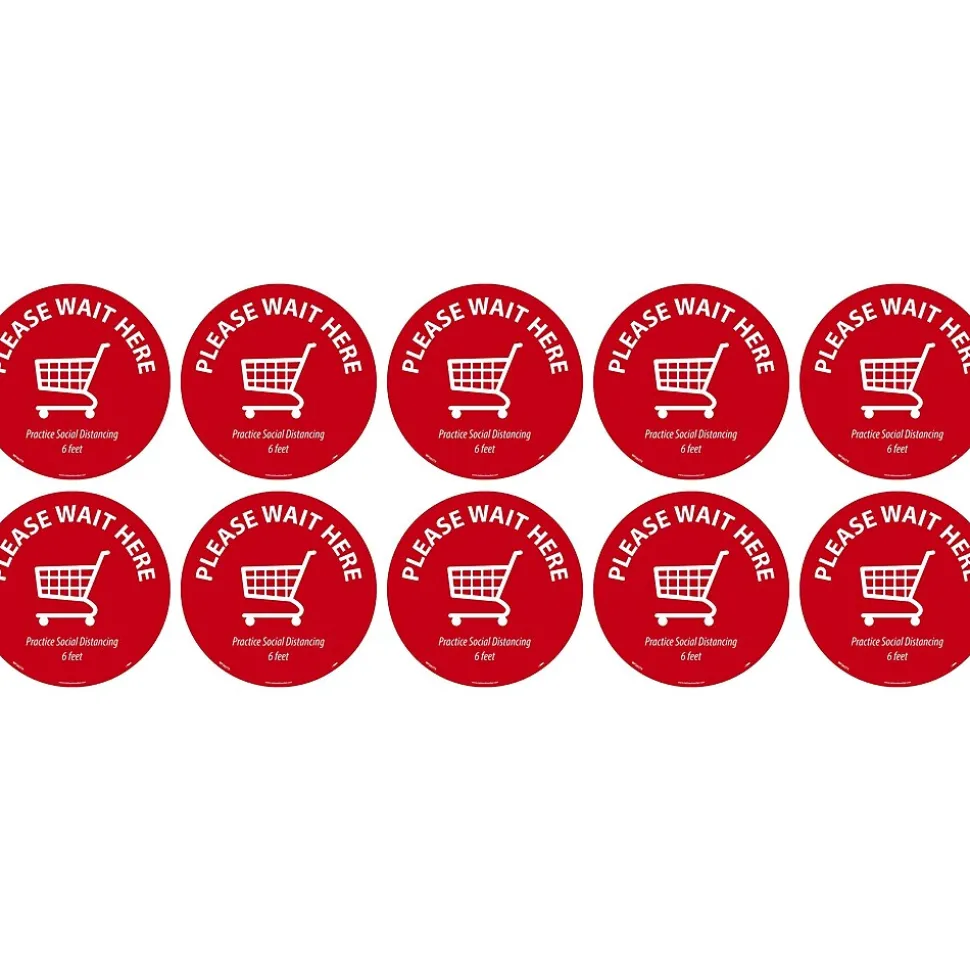 - Floor sign with the “Please Wait Here. Practice Social Distancing 6 feet” message imprinted in English