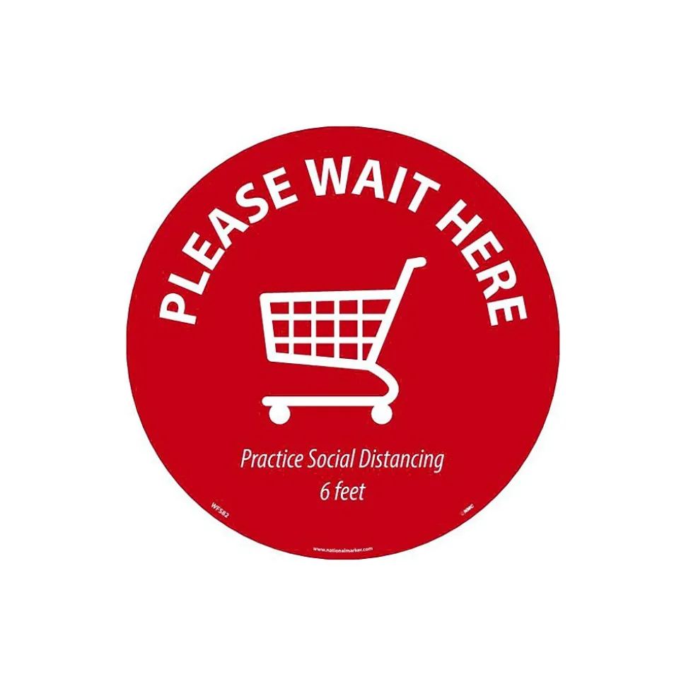 - Floor sign with the “Please Wait Here. Practice Social Distancing 6 Feet” message imprinted in English