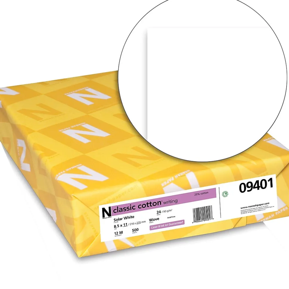 Neenah Paper Classic Cotton® Writing wove paper in solar white color measures 8 1/2″ x 11″ and is made of 25 percent cotton with genuine watermark for added security. Paper is ideal for resume or letterhead, sold as 500 sheets per ream.