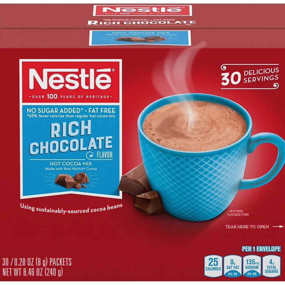 - Nestlé Hot Cocoa, No Sugar Added, Fat Free Rich Chocolate Flavor is a rich-tasting, no sugar added and fat free hot cocoa mix that creates a rich and indulgent chocolate flavor. Made with real Nestlé cocoa using sustainably-sourced cocoa beans.