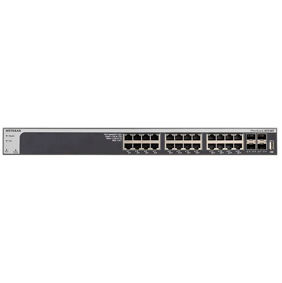 The NETGEAR XS728T Smart Switch is designed for desktop or rackmount and features 24-Ports of 10G Ethernet, 4 x 10Gigabit SFP+ ports, ProSAFE Lifetime Protection and more. Comprehensive Network Features Priced for Small and Medium Sized Businesses.