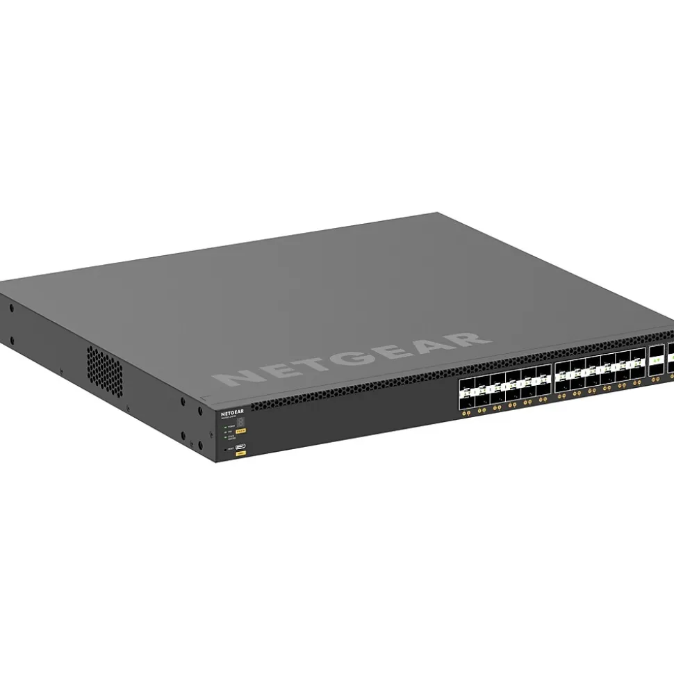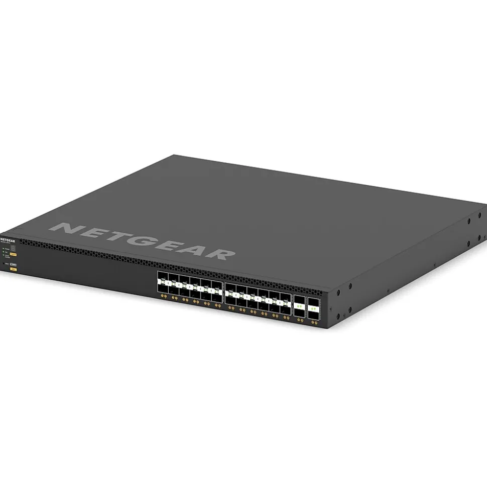 The Netgear M4350-24F4V Series is a 1RU layer 3 managed switch with 24x 10GBASE-X SFP+ ports and 4x 25GBASE-X SFP28 uplinks. Equipped with one slot for modular power supply (1+1 redundancy). Supports Virtual Chassis stacking provides non-stop forwarding (NSF) and hitless failover, NETGEAR IGMP Plus, AV User Interface, and Engage Controller speed up AV installations.