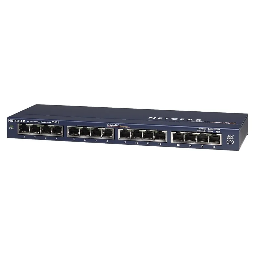 Now you can put together a powerful, high-speed network on a small scale. NETGEAR’s GS116 Copper Gigabit Ethernet Switch lets you build a system that can move even very large files across your network instantly — up to 2000Mbps on each port. The standards-based GS116 helps to protect customers’ existing and future network infrastructure investments by painlessly integrating other 10, 100, 1000 devices as well as honoring layer 2 802.1p priority tags. Packed with ease-of-use features, this adaptable switch supports either PC or Macintosh operating systems. The compact size makes it ideal for home, small office, workgroups, departments and conference room environments. Its durable metal case has no fan for silent operation.; Features; High-speed, auto-switching 10/100/1000Mbps Ethernet connection; Silently delivers up to 2000Mbps on each port; Integrates 10, 100, & 1000Mbps devices within a network; Honors Layer 2 802.1p traffic priority tags; Space-saving desktop dimensions; Package Contents;16-port Gigabit Switch GS116;Wall-mount kit; AC adapter; Installation guide; Warranty/Support information card