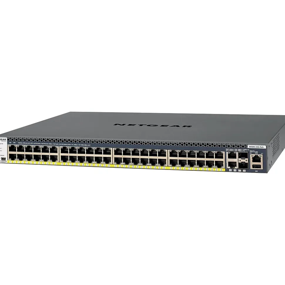 The Netgear® ProSAFE® GSM4352S-100NES 48-port managed Ethernet switch with full PoE+ provisioning, is been specially designed for server aggregation with Auto-iSCSI prioritization, wireless access, unified communications and IP video. This stackable switch delivers IPv4/IPv6 rich services for mid-enterprise edge and SMB core. The stacking and distributed link aggregation feature of this switch allows for multi-resiliency with zero downtime and load balancing capabilities. This switch incorporates new link dependency feature that enables or disables ports based on the link state of different ports. The layer 3 feature set of this switch includes static and policy-based routing, RIP, VRRP, OSPF and multicast PIM dynamic routing.