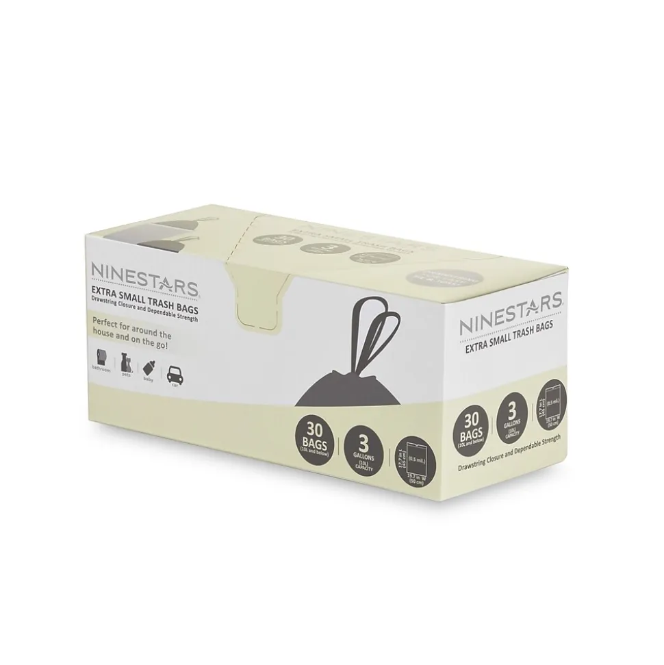 Nine Stars 3 gallons/10-12 liter white trash bag with drawstring closure. 30 count in a box. Trash bag dimensions: 17.7″ x 19.7″ x 0.5″. Drawstring closure seals the garbage smell and makes bag easy to close and carry. Strong layer helps protect against leaks. Great for kitchen, bathroom, and bedroom trash cans.