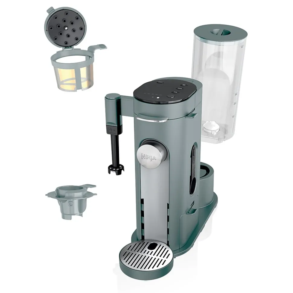 Ninja PB051SG Single-Serve Pods & Grounds Specialty Coffee Maker conveniently brews your favorite grounds and coffee pods in a compact footprint. Enjoy your coffee at home or on the go with 7 sizes from a 6-oz. cup to a 24-oz. travel mug. With Thermal Flavor Extraction DUO enjoy a Classic, Rich, Over Ice, or Specialty coffee. Create a coffeehouse-style drink at home with the built-in frother.