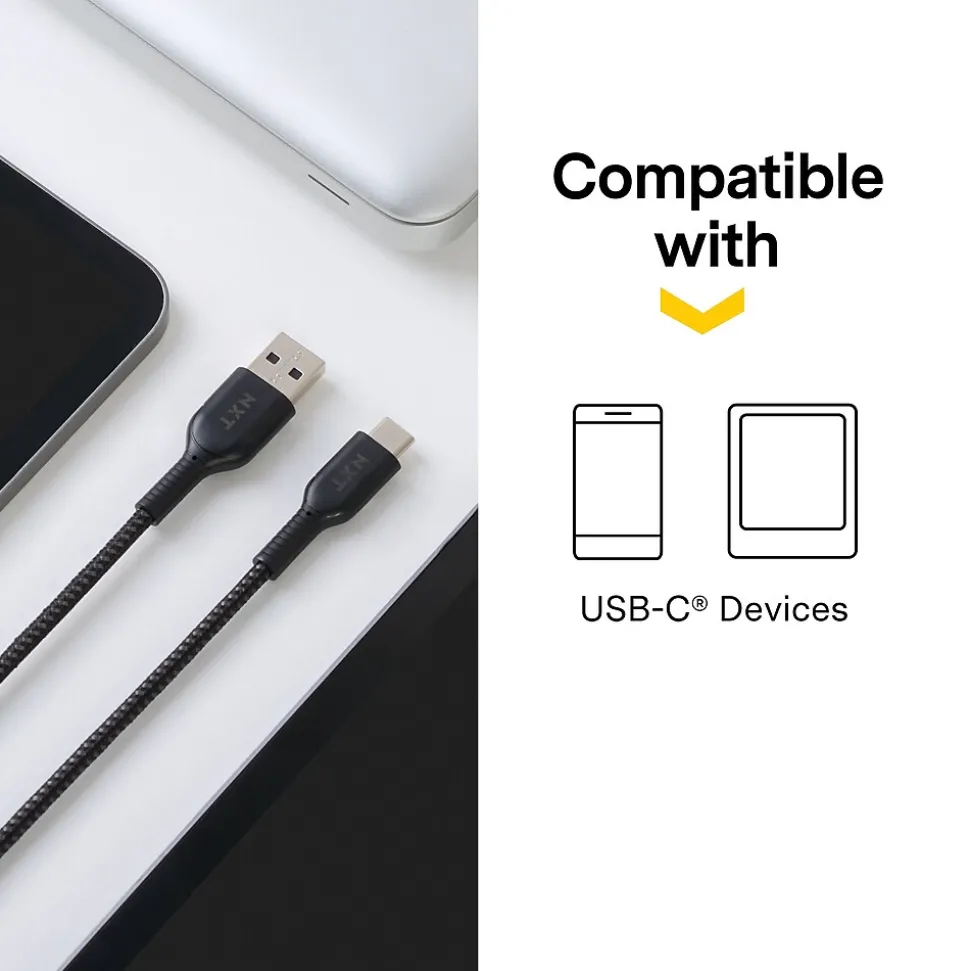 Plug this 6-foot cable into most laptops and chargers for reliable charging and syncing. The reversible USB-C adapter delivers effortless connections. With a sturdy braided design, this NXT Technologies™ USB-C to USB-A cable is ideal for daily use.