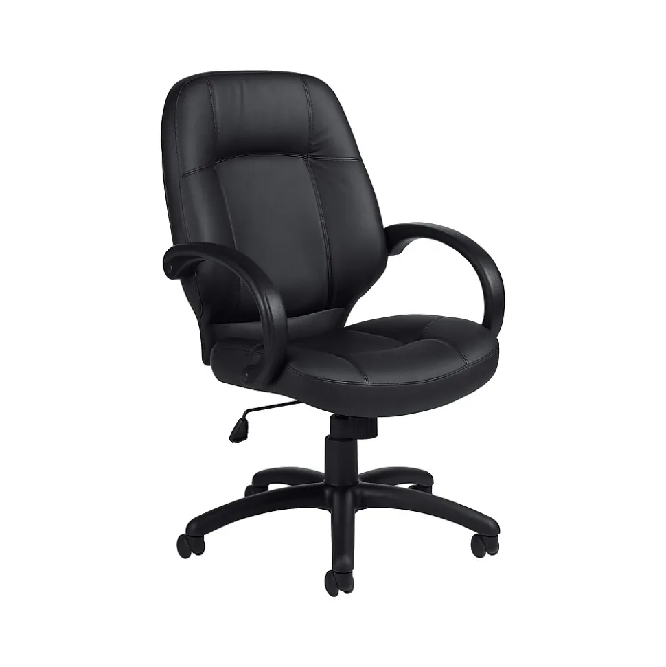 Outfit your private office or cubicle with executive chair. The black Luxhide upholstery offers a soft, inviting texture, and the thick segmented padding provides support for your upper and lower body. A waterfall seat edge keeps your legs more comfortable throughout the day. Use the single-position tilt lock and adjustable tilt tension to find the perfect seating angle, and raise or lower the seat height to match your desk setup. Simple controls make adjusting this chair quick and easy. With an arched five-star base and twin carpet casters, this Offices To Go executive chair glides effortlessly from one side of your workspace to the other.