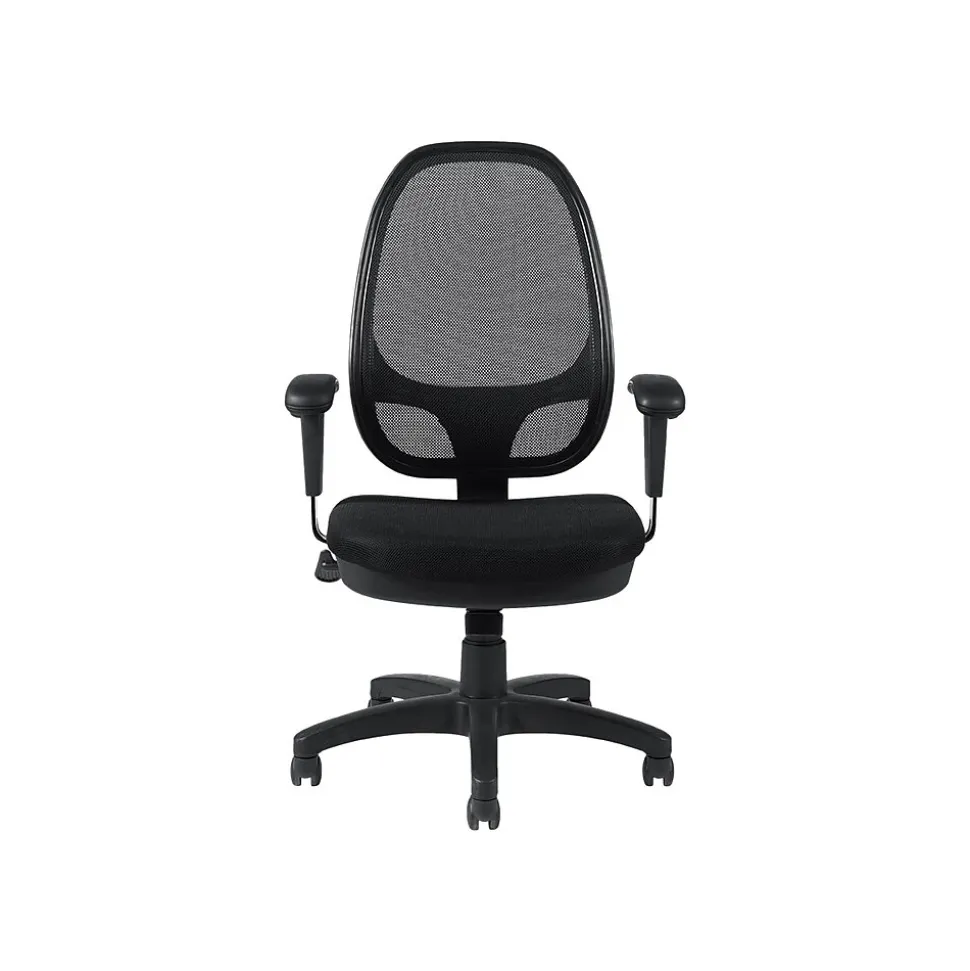 Create a more inviting seating arrangement in your workspace with this Office to Go high-back managers chair. With a scuff-resistant molded base and twin-wheel carpet casters, this office chair glides effortlessly across your floor. The breathable mesh upholstery and seat back allow for better air circulation, keeping you cool throughout the workday. Single-position tilt lock, center-tilt and tilt-tension control let you recline back in the seat at the perfect angle, while the pneumatic height-adjustment lever makes it easy to raise or lower the seat as needed. Boasting contoured height-adjustable arms, this Office to Go high-back managers chair provides added support for your shoulders, arms and hands.