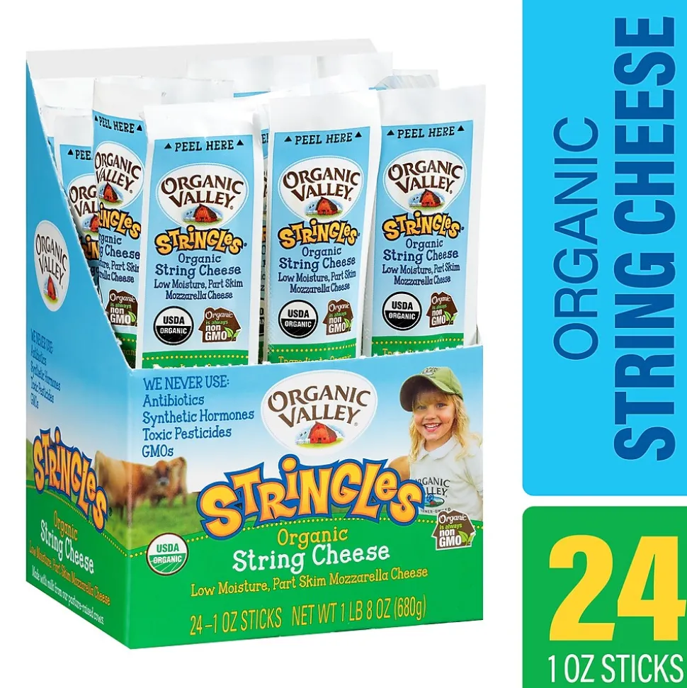 Organic Valley Mozzarella string cheese in convenient, ready-to-go packages! Each serving contains seven grams of pure, organic protein so your kids can grab, enjoy, and keep moving. As always, our Stringles are made from milk produced without hormones, antibiotics or GMOs. With 24 total string cheeses, there’s enough to go around for the whole family!
