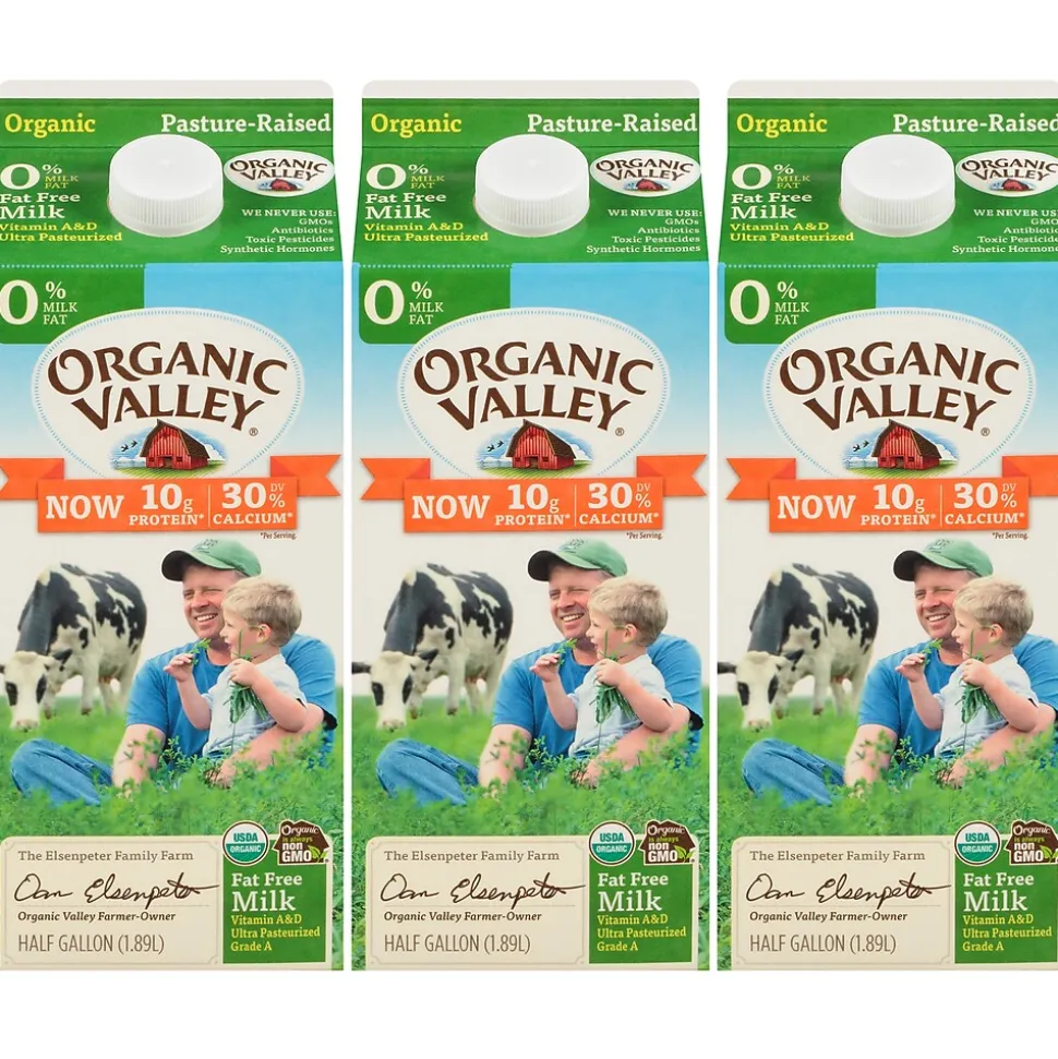- A 3 pack of Organic Valley Ultra Pasteurized Fat Free Skim Milk in 64oz cartons