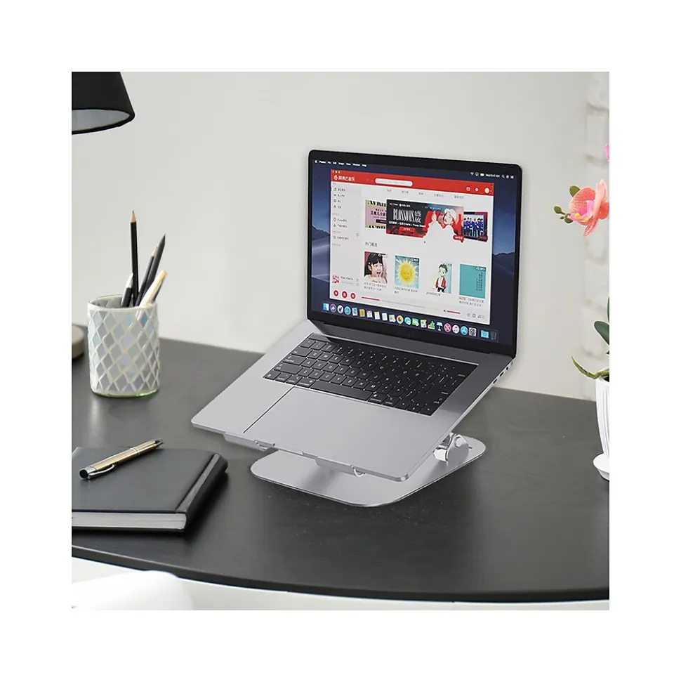 This OTM Essentials adjustable laptop riser stand helps raise your laptop to a perfect working position. The aluminum construction provides a sleek look and is both portable and lightweight.