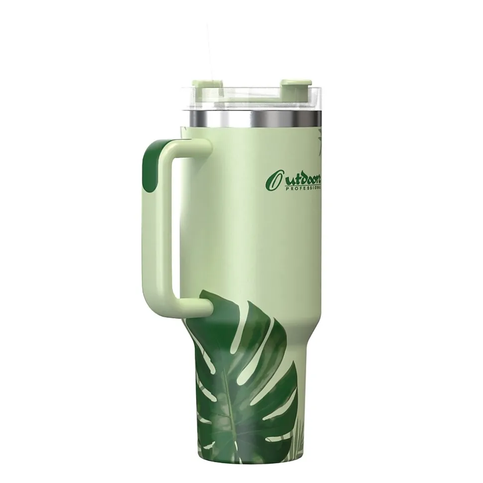 The Outdoors Professional 40-Oz. Tropical Green Tumbler’s double-walled, vacuum-insulated technology will keep iced drinks cold for up to 48 hours, no-ice drinks chilled up to 11 hours, and hot drinks hot for up to 7 hours! No more settling for lukewarm sips or diluted flavors! If you’re on the go, this tumbler is built to fit any standard cup-holder. These tumblers are lightweight and durable. Crafted with stainless steel that is 100% BPA-free and nontoxic, this tumbler is built to withstand the rigors of everyday use, ensuring its durability for years to come. This tumbler features a screw-on splashproof straw lid to avoid spills and leaks. It’s not only lightweight and easy to carry but super easy to clean. Hand-washing is a breeze as the wide mouth allows for effortless access to every nook and cranny. It’s also dishwasher-friendly: simply toss it in, let the dishwasher work its magic, and have a sparkling clean tumbler!