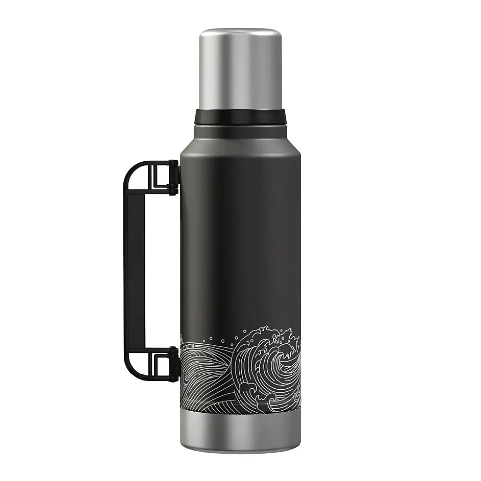 The Outdoors Professional Black Waves 33.8-Oz. Termo Classic Vacuum Bottle with Carry Handle is made with superior insulation that keeps liquids (soup, coffee, tea) hot for up to 24 hours or cold drinks cool for up to 24 hours. Add ice to your favorite beverage and the Termo classic will keep it cold for up to 5 days. The rustproof stainless steel construction means it can work just as hard as you do without impacting its performance. This is an ideal bottle to throw in your truck, work bag, or travel with it. It’s made with BPA-free materials, keeping its contents safe to consume. This 1-L bottle features a leak-resistant lid, so you can put it in your backpack without worrying about any spills. The wide mouth opening helps with easy pouring into the lid that doubles as a cup. The collapsible handle makes it easy to transport when you’re on the go.