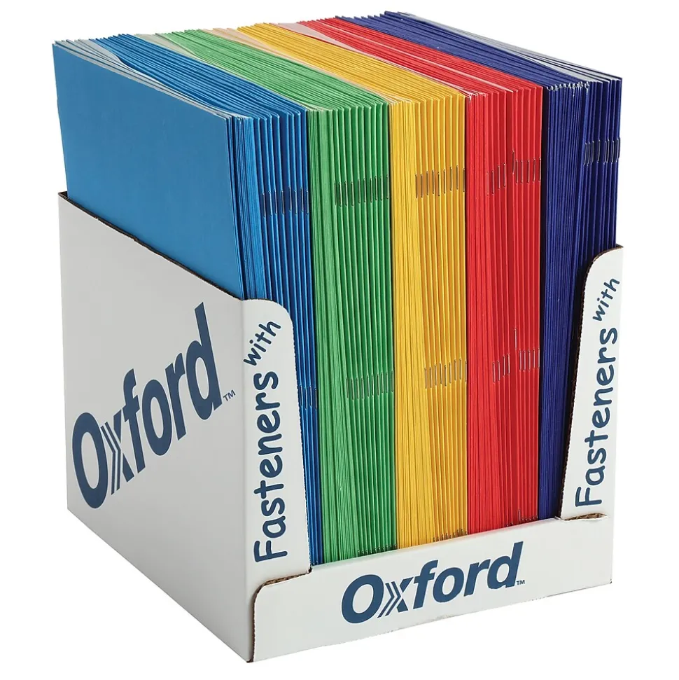 Oxford™ Twin Pocket Folders store up to 135 sheets of letter-sized paper. The built-in, 2-prong metal fasteners prevent important papers from falling out. Die-cut business card holder on inside pocket. Paper made from 10% recycled fiber with 10% post consumer fiber. Letter size. 100 Per box in assorted colors.