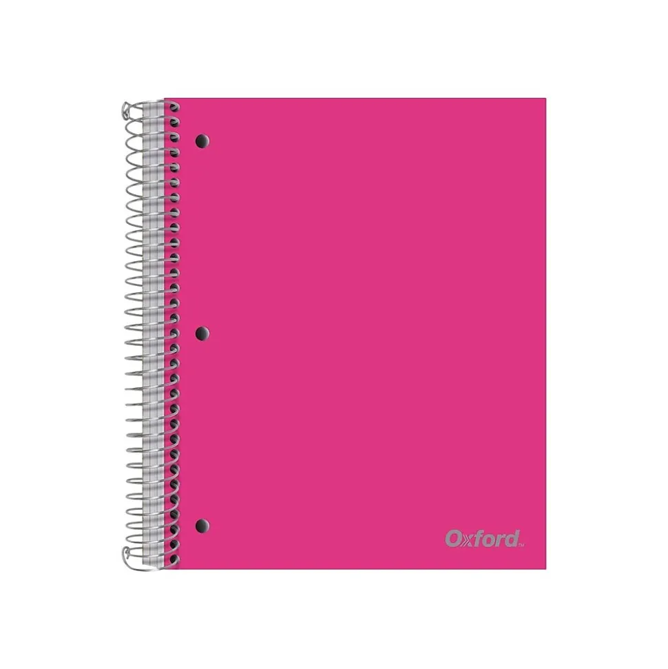 This Oxford three-subject poly notebook comes in bright colors and is three-hole punched to fit a standard binder. Includes three poly divider pockets and a strong no-snag coil. Comes in assorted colors.