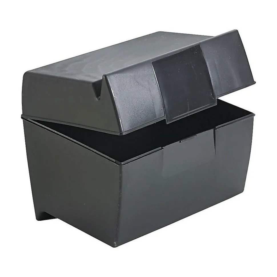 Arrange phone numbers, addresses, and other information inside this index box. The compact size fits neatly on a desktop or inside a box drawer, and the plastic construction offers long-lasting durability. This Oxford index box features a groove on the lid to hold cards upright for easy viewing.