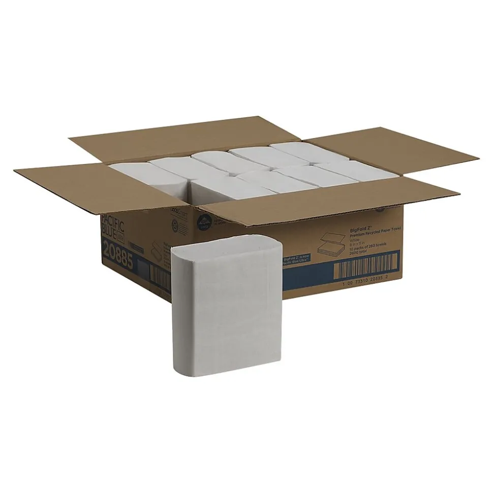 Stock restrooms, break rooms and other shared spaces with these multifold paper towels. The white color offers a crisp appearance, and the folded design fits neatly in compatible dispensers. Each towel features absorbent construction, making it simple to soak up spills, splashes and other messes. Each bundle comes conveniently wrapped for easy storage. These Pacific Blue Ultra Z-Fold one-ply paper towels come in a 2600-count case, providing an ample supply for busy offices, restaurants or other commercial locations.