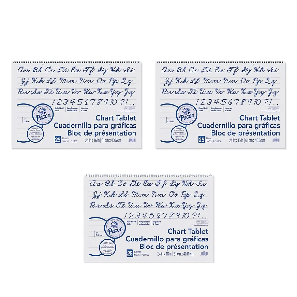 This Chart Tablet features White sulphite bond paper that is spiral bound to stiff covers with a Cursive alphabet printed inside. It is 2-hole punched for easy hanging. Paper is 1″ ruled on both sides, and works well for classroom anchor charts, posters and other teaching aids. Measures 24″ x 16″. Each tablet includes 25 sheets. Sold as a pack of 3 tablets.
