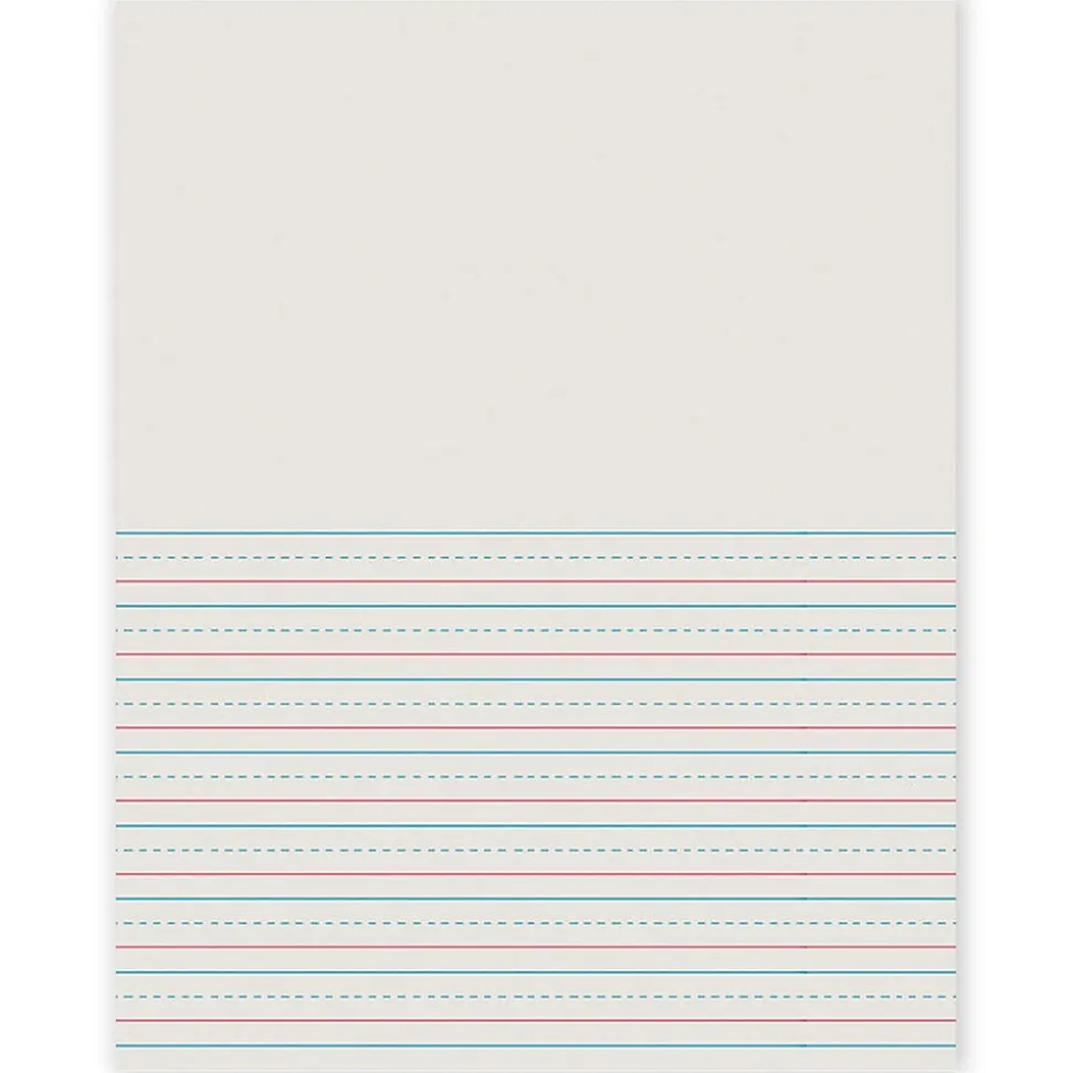 - Clean White newsprint that’s 1/2″ ruled on both sides with 1/4″ blue dotted midline, red baseline and 1/4″ skip space