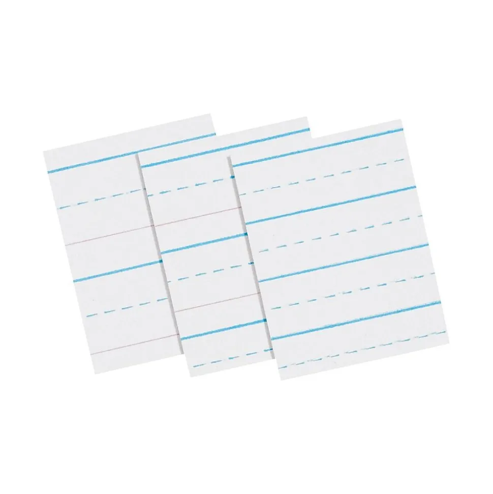 Clean white newsprint printed both sides with blue headline, broken blue midline, red baseline and skip-A-line format. Rulings conform to D’Nealian™ handwriting program.
