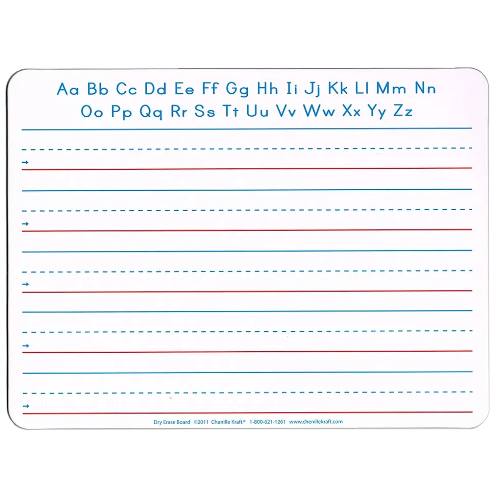 - Double-sided writing whiteboard is lined on one-side for writing practice and plain on the other for a variety of activities.