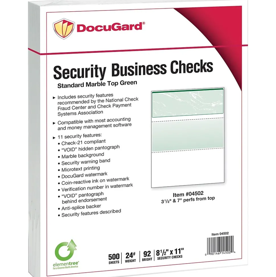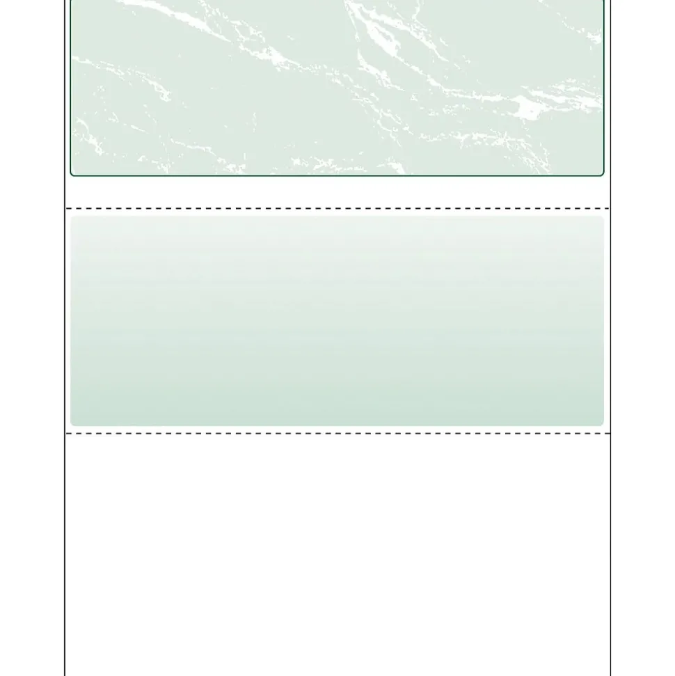 Paris DocuGard® Standard security business top check paper in green color has 24 lbs paper weight and is deal for inkjet/laser printers. 8 1/2″ x 11″ Paper with marble check pattern is used in payroll and accounts payable, sold as 2500 per case.