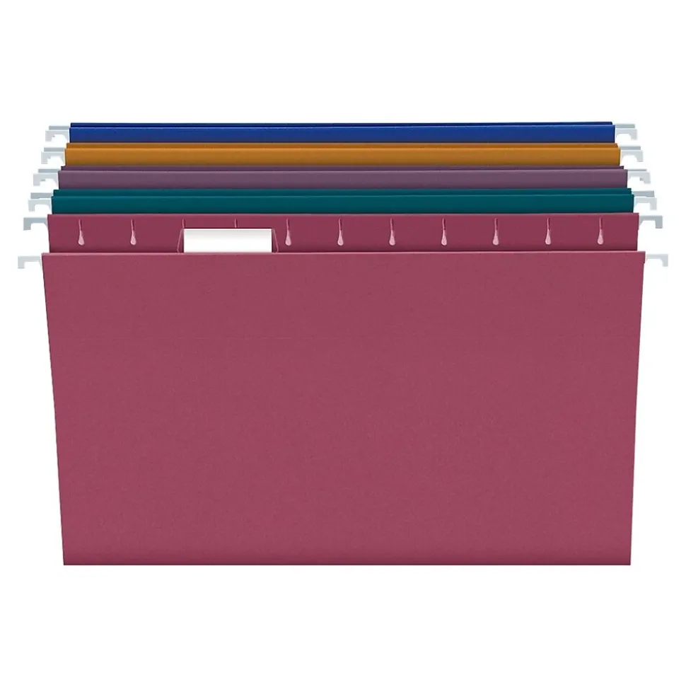 Group client or account files together with these Pendaflex hanging file folders. The assorted hues let you color-code your filing system to make important paperwork easy to find. Each folder features hooks, which move smoothly across hanging folder glides. With five tab positions, these Pendaflex hanging file folders offer convenient and flexible labeling options.