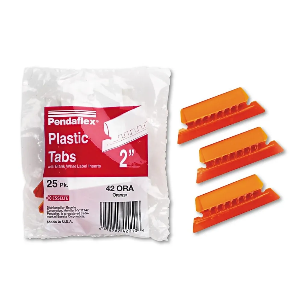Pendaflex Hanging Folder Tabs allow you to customize your hanging folders. Clear orange plastic tabs (2″ wide) with blank white inserts. Stagger the position of your tabs from folder to folder to keep each file heading in view. Tabs are large and angled for easy viewing. For letter and legal-sized hanging folders. 25 Tabs and inserts per pack.
