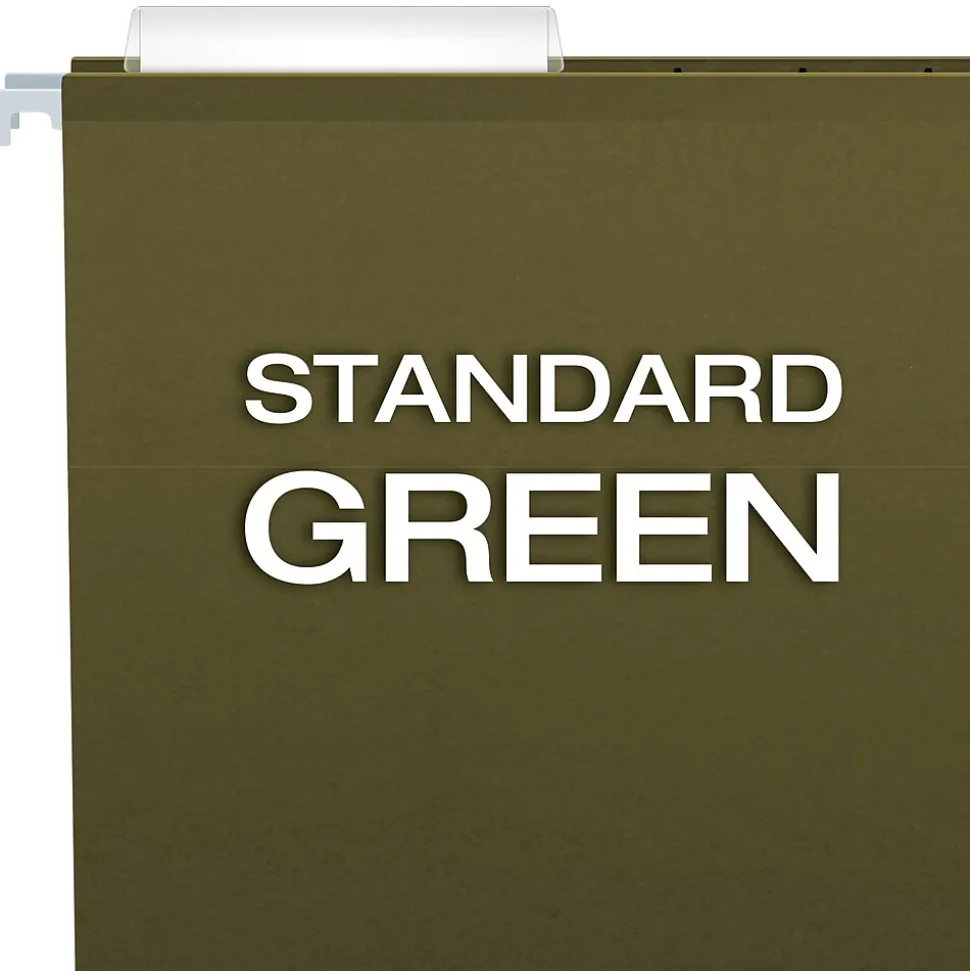 - Green reinforced paper stock hanging folders for general or color-coded filing