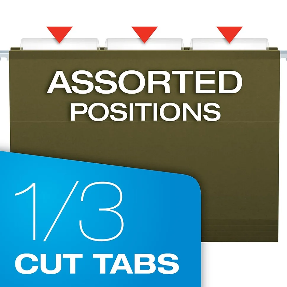 Organize documents with these hanging file folders. These folders feature special strips on their edges to guard against tearing. The interiors of these folders have a lighter color than their exteriors, which helps prevent documents from being misfiled. Each box of Pendaflex reinforced hanging file folders comes with a label sheet and tabs to help users separate their items.