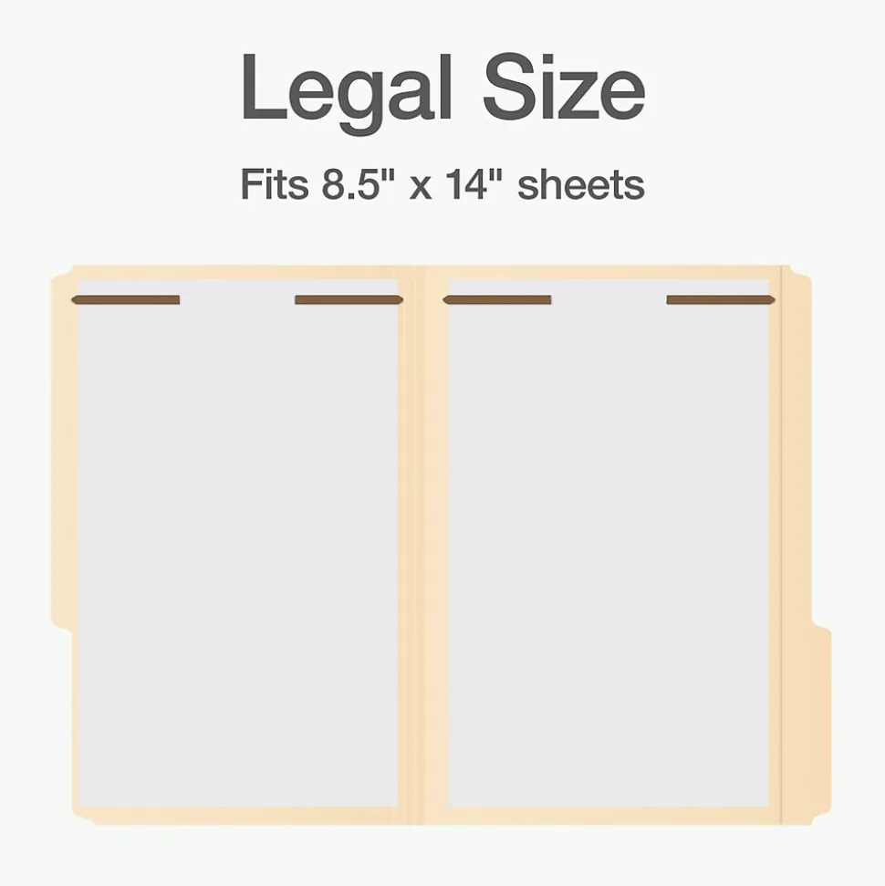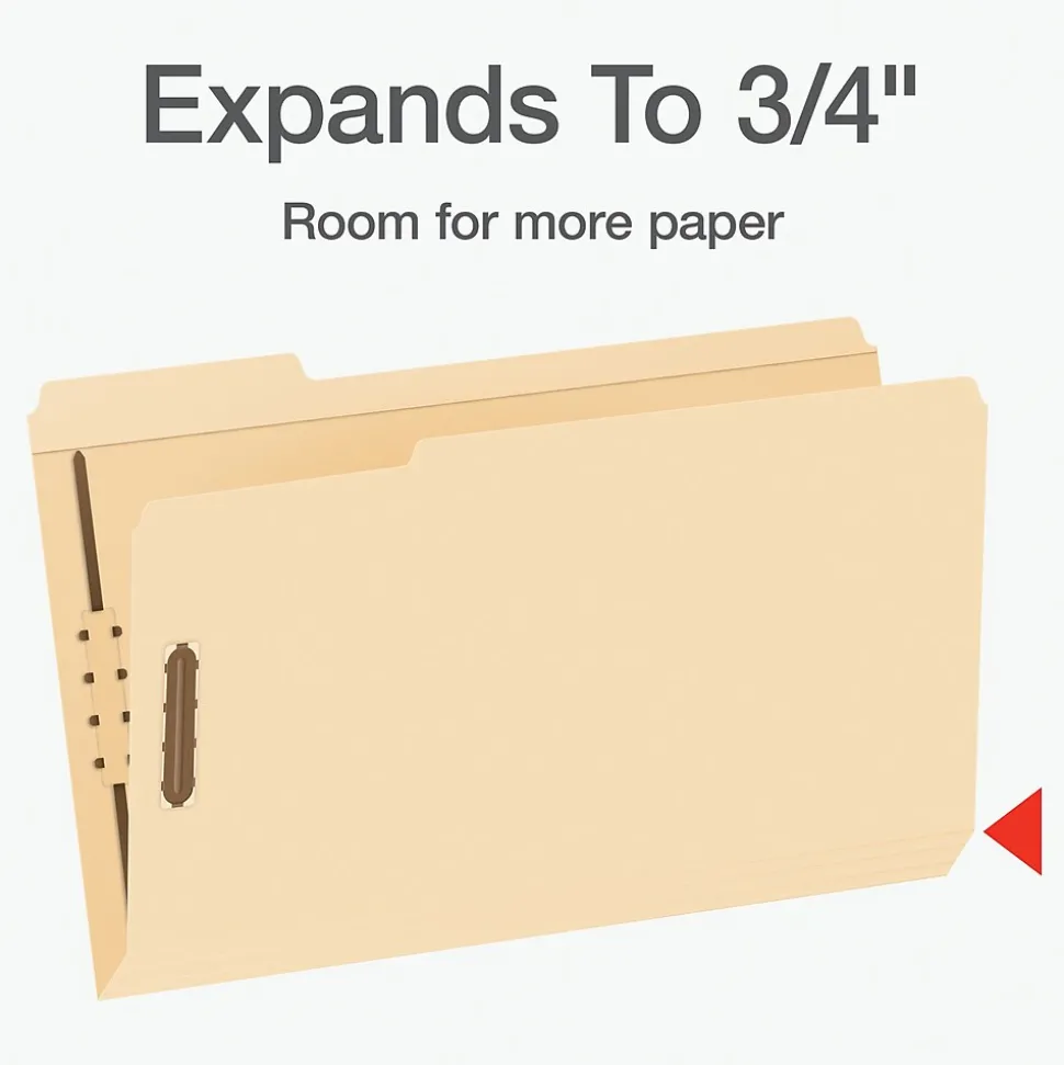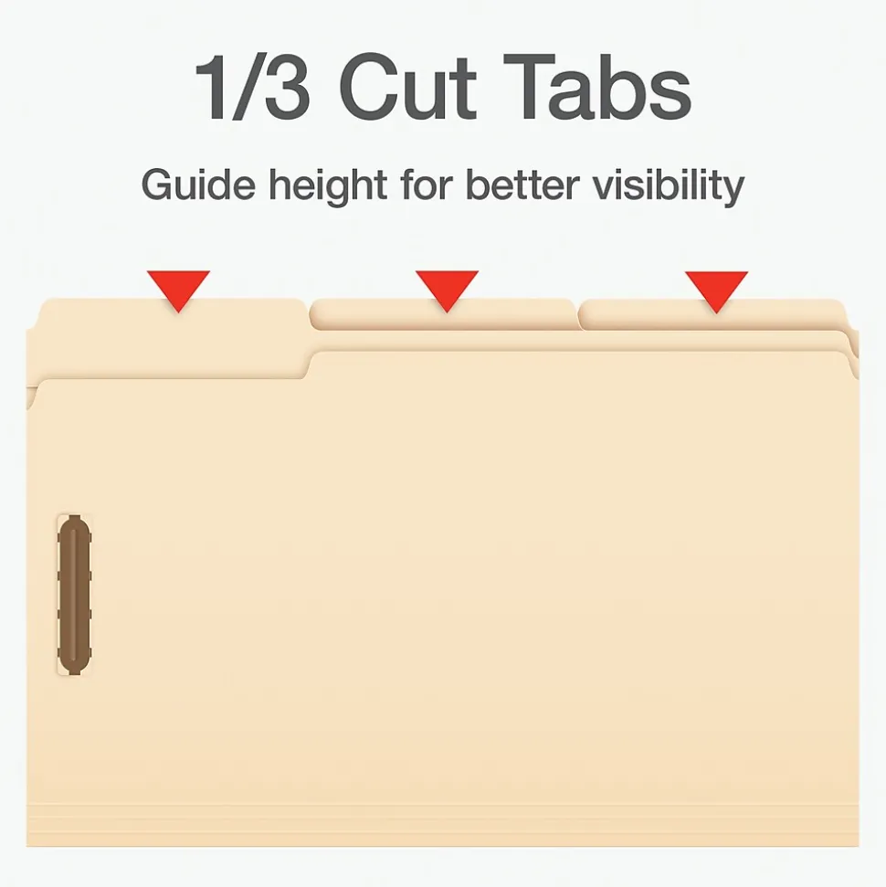 These Pendaflex Fastener Folders have thick, reinforced tabs that will better withstand wear and tear. Two embedded fasteners keep paperwork ordered and in place. The 1/3 cut tabs are guide height for better visibility and come in 3 different positions (left, right, center), so you can see all of your labeled tabs easily. Each folder fits legal-sized papers and is scored along the bottom for 3/4 inch expansion. Box of 50 manila fastener folders.