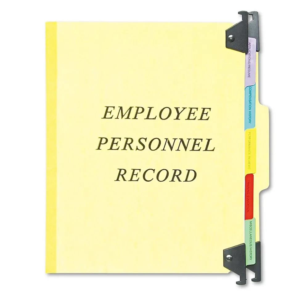 Organize personnel information with this smart classification folder. 1/3 cut tab in middle position for employee’s name. Five Mylar reinforced tab dividers within folder: Application/Resume, Compensation History, Performance Reviews, Training/Education, Miscellaneous/History. Reinforced Tyvek tape gusset for expansion to accommodate a growing file. Durable 20 pt. PressGuard, acrylic coated to resist moisture and smudges. Acid-free.