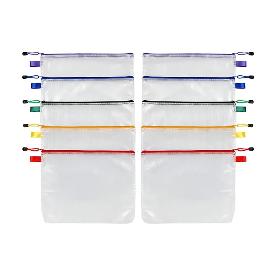 - Made of clear poly with zipper and attachment loop in assorted colors (two red, two yellow, two green, two purple, two blue)