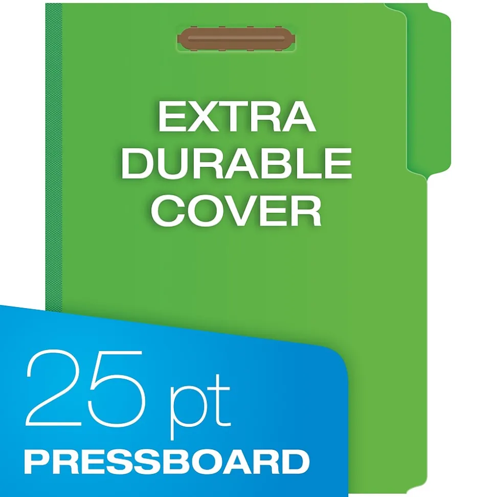 Pendaflex Pressboard Fastener Folders have durable hard covers with two embedded 2″ fasteners to keep important papers in place front and back. A 2″ expanding spine holds up to 400 sheets. Letter size, dark green. 1/3-Cut tabs in assorted positions. 25 Per box.