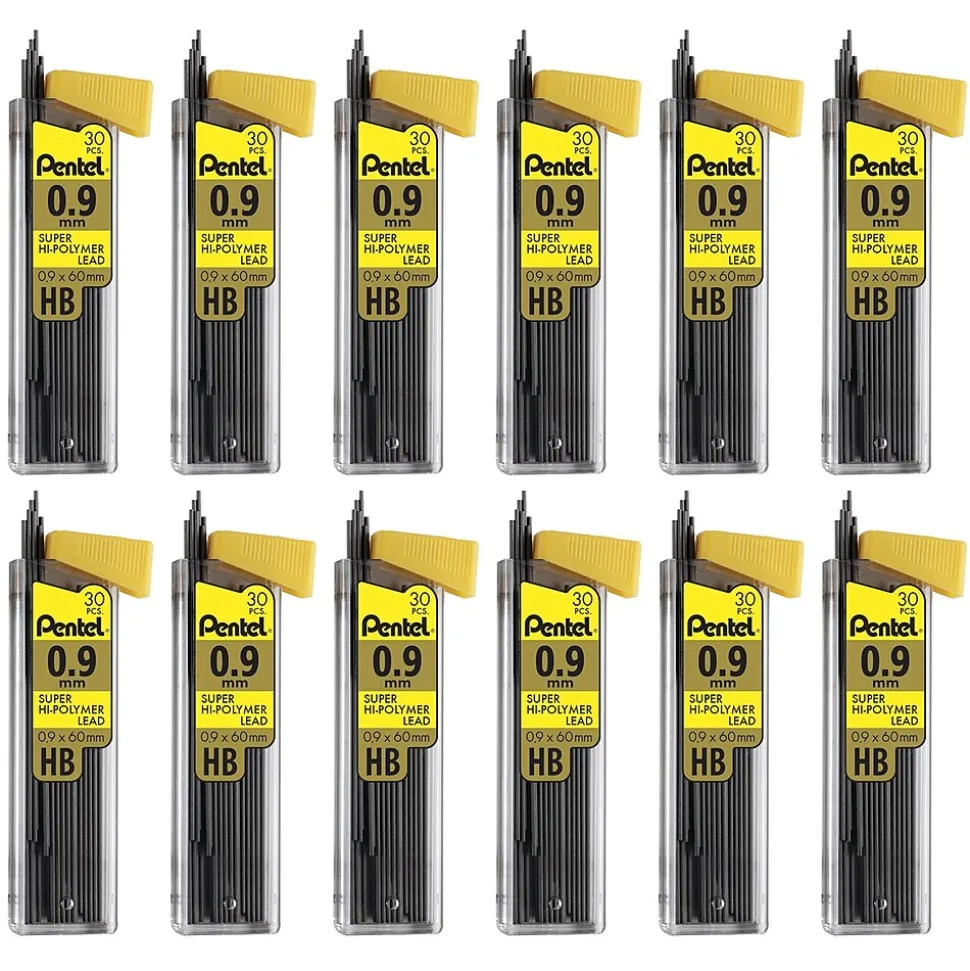 Pentel® Super Hi-Polymer® Lead is the #1 selling brand in the USA! HB Lead is guaranteed to scan, never needs sharpening, is strong and produces a clear dark line. 0.9mm lead creates bold lines of consistent density and is equivalent to a #2 pencil. Each tube of Pentel Super Hi-Polymer HB lead is made of 100% recycled plastic and part of the Pentel Recycology line of products. Each tube contains 30 pieces. Sold as 12 tubes for a total of 360 pieces.