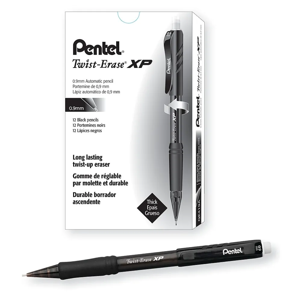 Draft plans, create charts and graphs or write notes with these black-barrel mechanical pencils. With a latex-free rubber grip, these Pentel Twist-Erase mechanical pencils are comfortable, making them ideal for extended writing sessions.