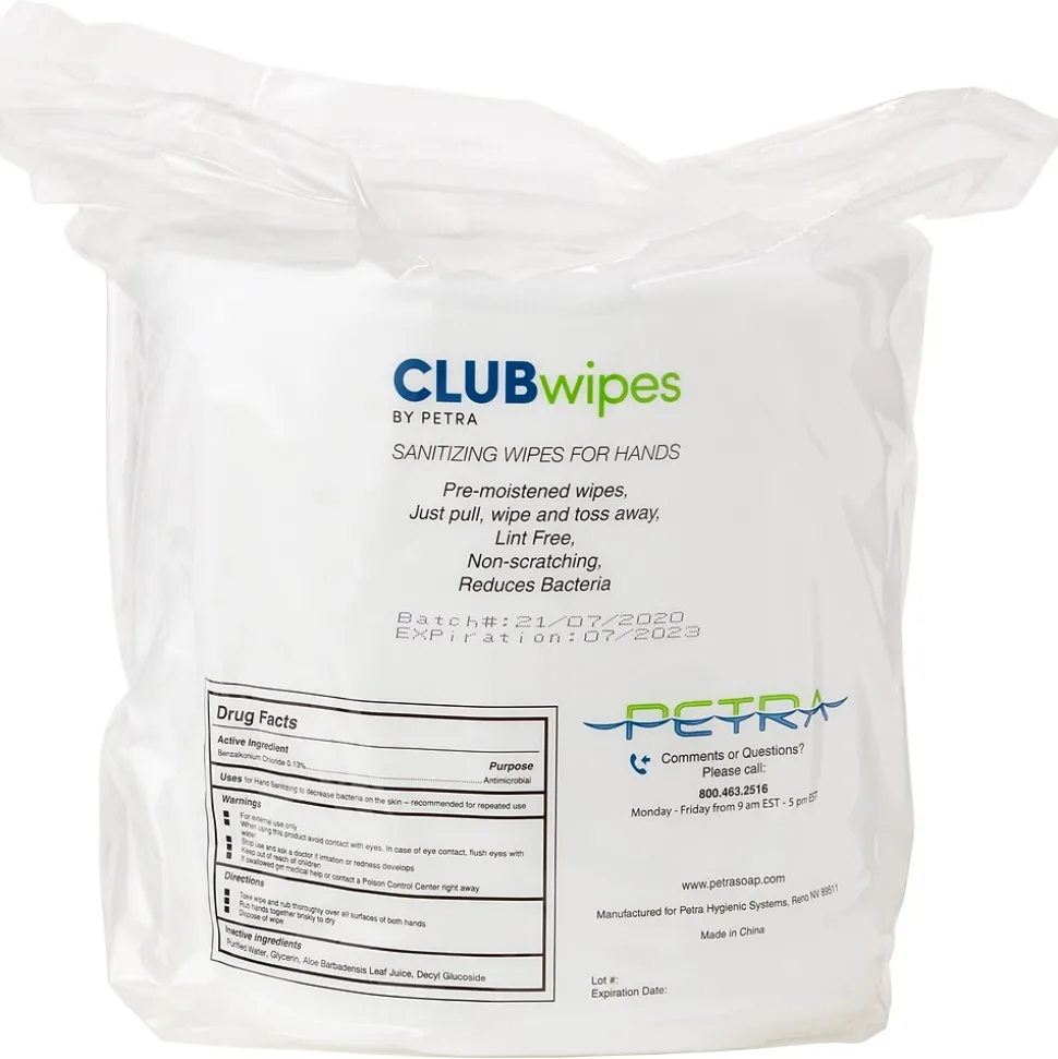 Petra CLUBwipes are antiseptic skin sanitizing wipes that kill harmful bacteria and germs. Each wipe contains benzalkonium chloride which acts as an active ingredient and is known to be effective in destroying harmful bacteria to provide antiseptic cleaning.