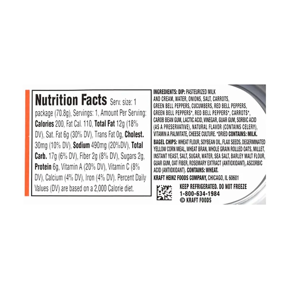 Philadelphia bagel chips and garden vegetable cream cheese dip is a convenient and flavorful on-the-go snack that is easy to carry anywhere. The deliciously smooth cream cheese dip pairs perfectly with multigrain bagel chips. The chips and cream cheese dip stay separated in the convenient 2.5 oz. tray, enough to fill your snack cravings any time of day. With no artificial flavors, this is a snack pack you can feel good about.