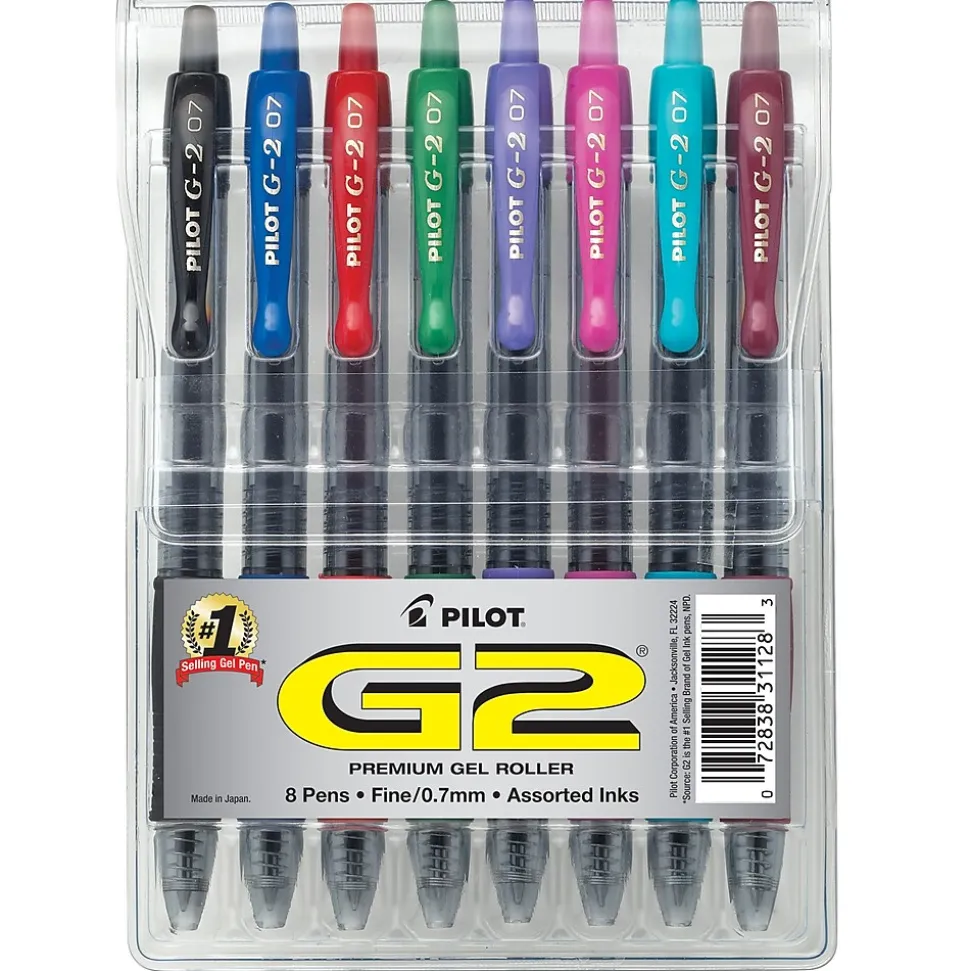 Make your writing stand out with these Pilot G2 premium retractable gel roller pens. These pens feature a fine point, so you can produce sharp, clear lines with each stroke, while their plastic clips make them convenient to carry in a shirt pocket for quick access. These Pilot G2 premium retractable gel roller pens have eight assorted colors, letting you create dynamic presentations.