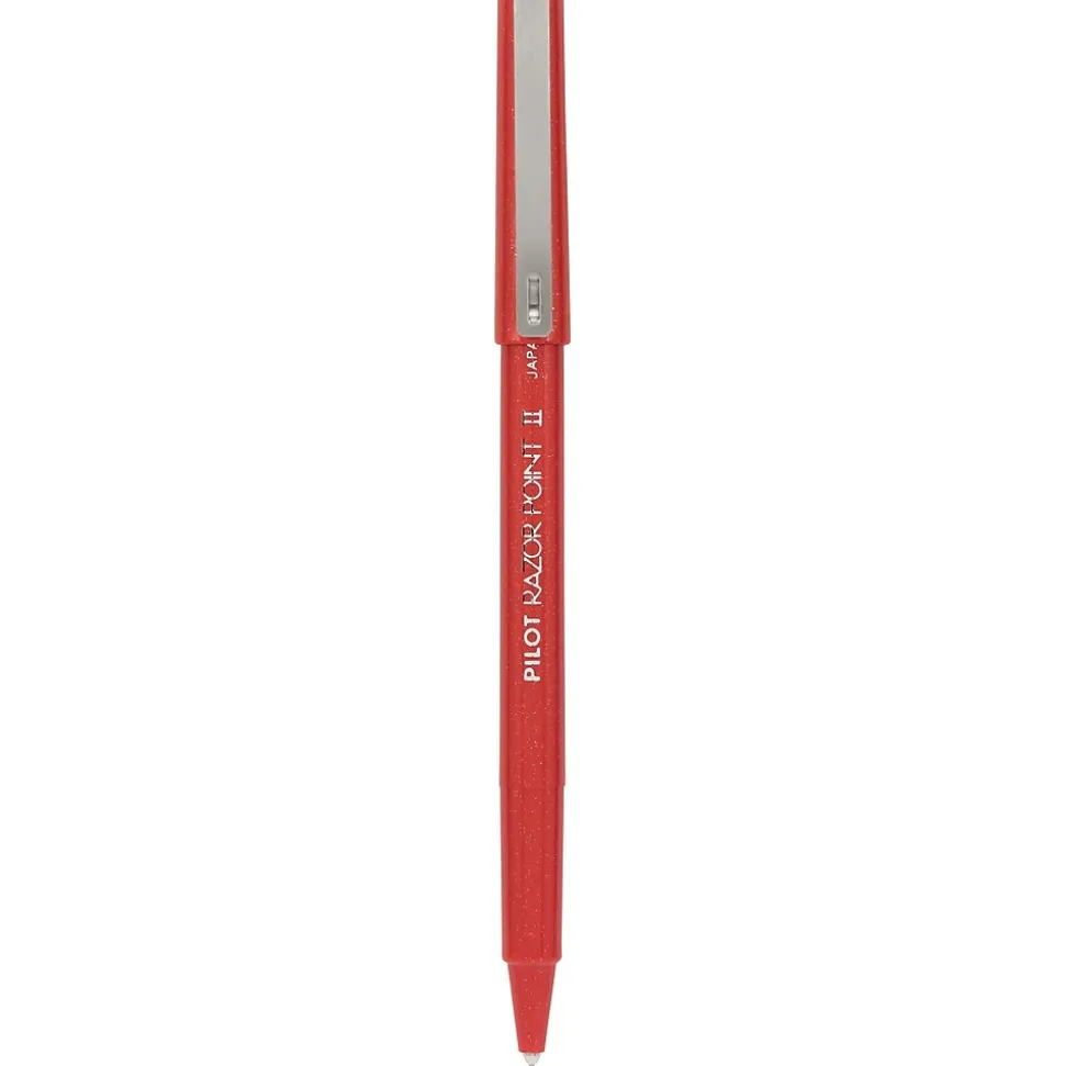 Enjoy comfortable writing with these super-fine-point red marker pens. The red finish on the barrels has subtle sparkles to provide a stylish appearance, while the sturdy metal clips let you stow them in a pocket or notebook for simple portability. These Pilot Razor Point II red marker pens come in a 12-pack, so it’s easy to keep supplies stocked up.