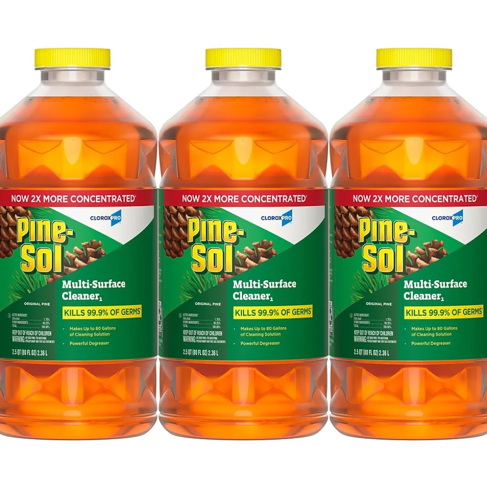 With Pine-Sol Multi-Surface Cleaner from CloroxPro, you only need one product to fight tough dirt, grease and grime. A 2X concentrated formula** delivers more cleaning power per drop than previous Pine-Sol Pine formula. Easier to handle and easier to store, the space saving bottle gives you more cleaning solution in a smaller bottle made of 30% less plastic***. This multipurpose cleaner cleans, deodorizes and disinfects in one step, killing 99.9% of germs**** and leaving a classic pine scent. It cuts through grime and soap scum and is safe for use on wood, tile, stone, glass and more when used as directed on hard nonporous surfaces. Do not use on marble, aluminum, copper or wood that is unfinished, unsealed, unpainted, waxed, oiled or worn. *When used as directed on hard nonporous surfaces. **Vs. Original Pine-Sol Multi-Surface Cleaner. ***Vs previous Pine-Sol 144 ounce bottle. ****Salmonella enterica, Staphylococcus aureus, Influenza A virus and SARS-CoV-2 (Cause of COVID-19).