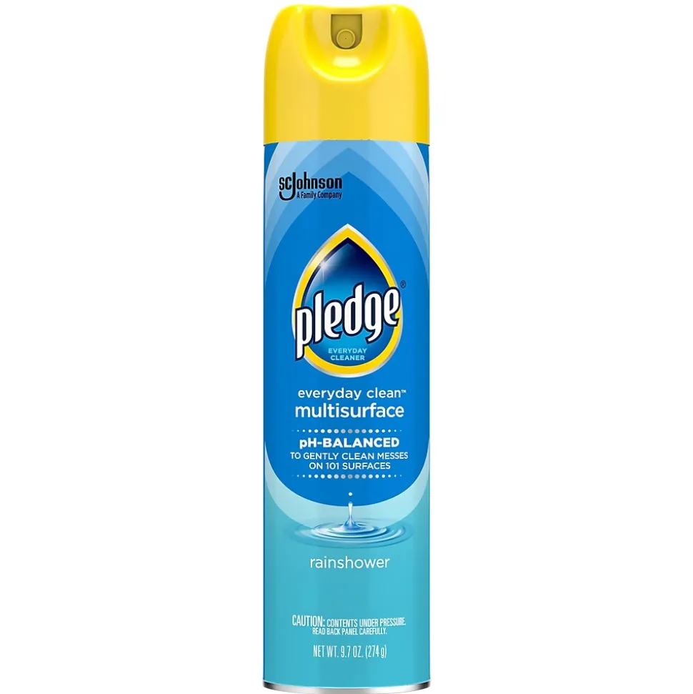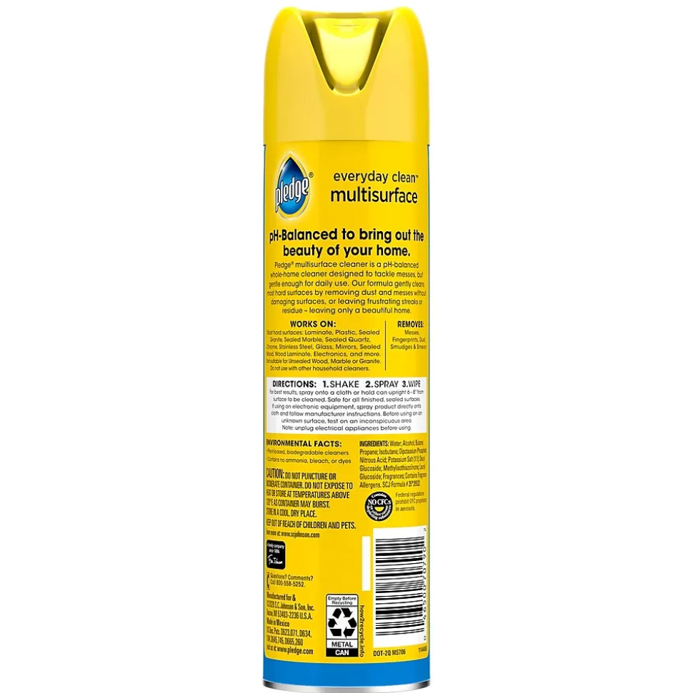 Dust, polish and shine hard surfaces with this 9.7-ounce multi-surface cleaner. The tall, cylindrical shape of the container makes it easy to fit in storage closets, while the spray nozzle provides ease of use. This Pledge multi-surface cleaner boasts a refreshing scent and cleans without leaving behind a smeary residue, so surfaces look pristine.