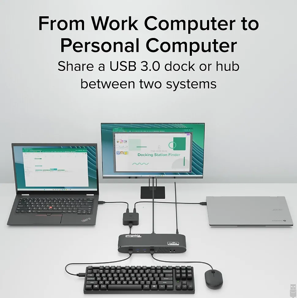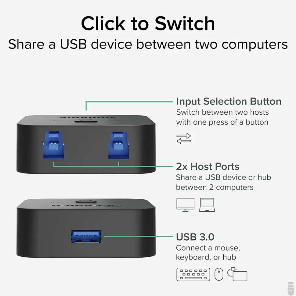 The Plugable USB3-Switch2 sharing switch saves your desk space with its slim design and offers maximum compatibility for all USB with plug and play convenience. This USB3-Switch2 is easy to install without any drivers and the shared devices are hot-swapped between computers by one button press. The two LED indicators make you to know which computer has the device right now. The 1 “A” port connects any USB 3.0, 2.0 or 1.1 device/hub and 2 “B” port connects the switch to two hosts.