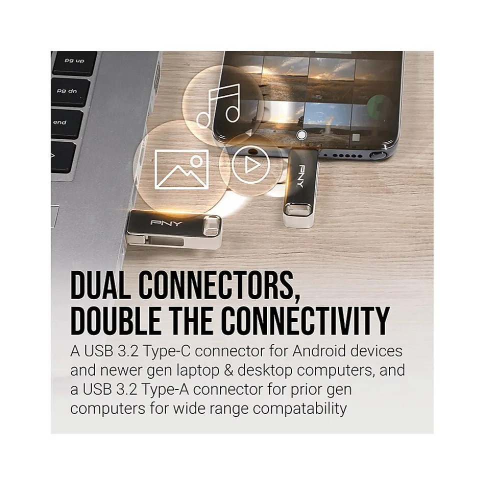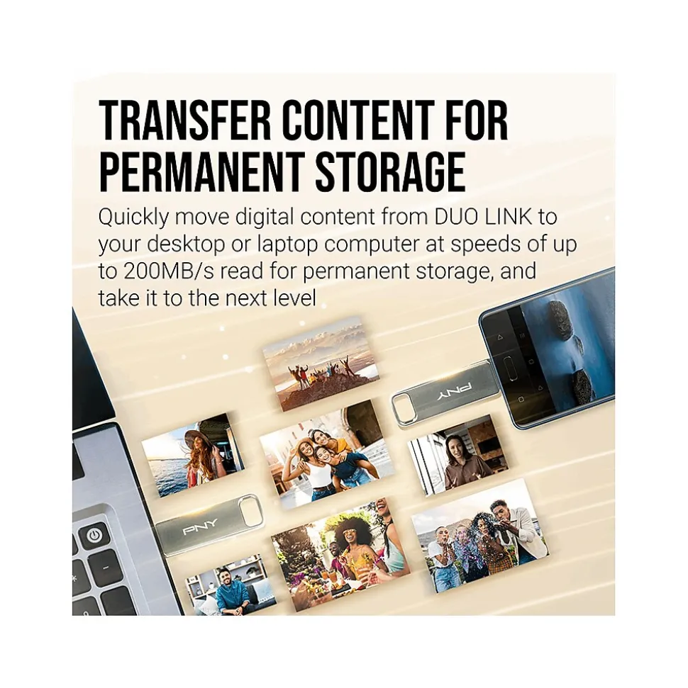 The PNY DUO LINK USB 3.2 Type-C dual flash drive bridges the gap between mobile and desktop, making it a perfect mobile storage solution for file management on-the-go. The DUO LINK is a perfect tool to free up space on USB Type-C equipped mobile devices by allowing users to move content such as photos, videos, music, and more from their smartphones and tablets to the drive, making room for more and ensuring they will never miss an opportunity to capture content due to lack of memory. What’s more, the DUO LINK dual flash drive allows for the transfer of content to full-size devices such as laptop and desktop computers for permanent storage. With read speeds of up to 200MB/s and transfer speeds up to 30 times faster than USB 2.0, moving content from the drive to a computer is quick and easy. From there, users can take their content to the next level and create videos, social posts, process prints, or simply save their files on a more permanent storage device. The DUO LINK is perfect for use across operating systems and host devices. With a USB 3.2 Type-C connector for Type-C Android mobile devices and newer-generation PC and Mac laptop and desktop computers, and a USB 3.2 Type-A connector for previous-generation computers, the potential for content creation and file management is near limitless.