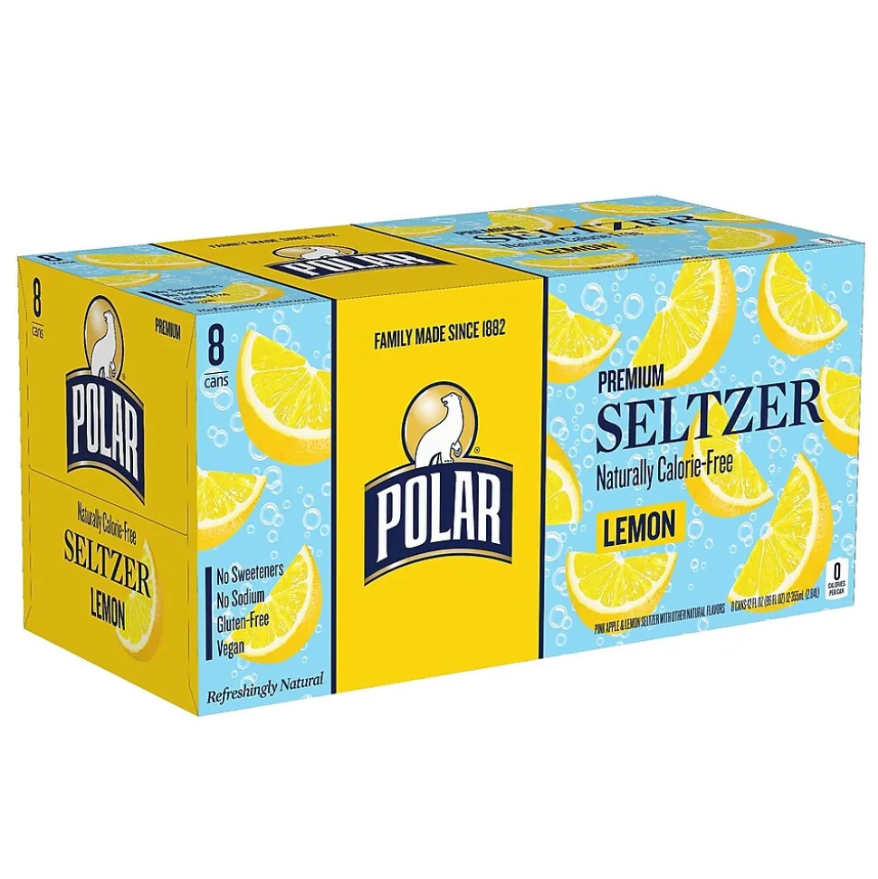 Stock up the vending machine, break room fridge or lobby with these cans of lemon seltzer. The sparkling water adds a nice carbonated fizz, while the light, lemon flavor gives a refreshing taste. This Polar lemon seltzer contains no calories and features 24 cans in each pack, so you always have plenty on hand.
