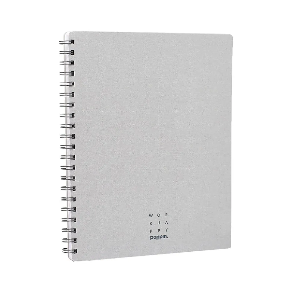 The Poppin Work Happy one-subject spiral notebook lies perfectly flat for taking notes in meetings, conferences, or class. The book cloth cover and a reminder to work happy offer a sophisticated take on the backpack staple. The heavy-duty painted spiral provides a pop of color.