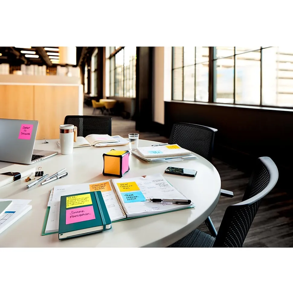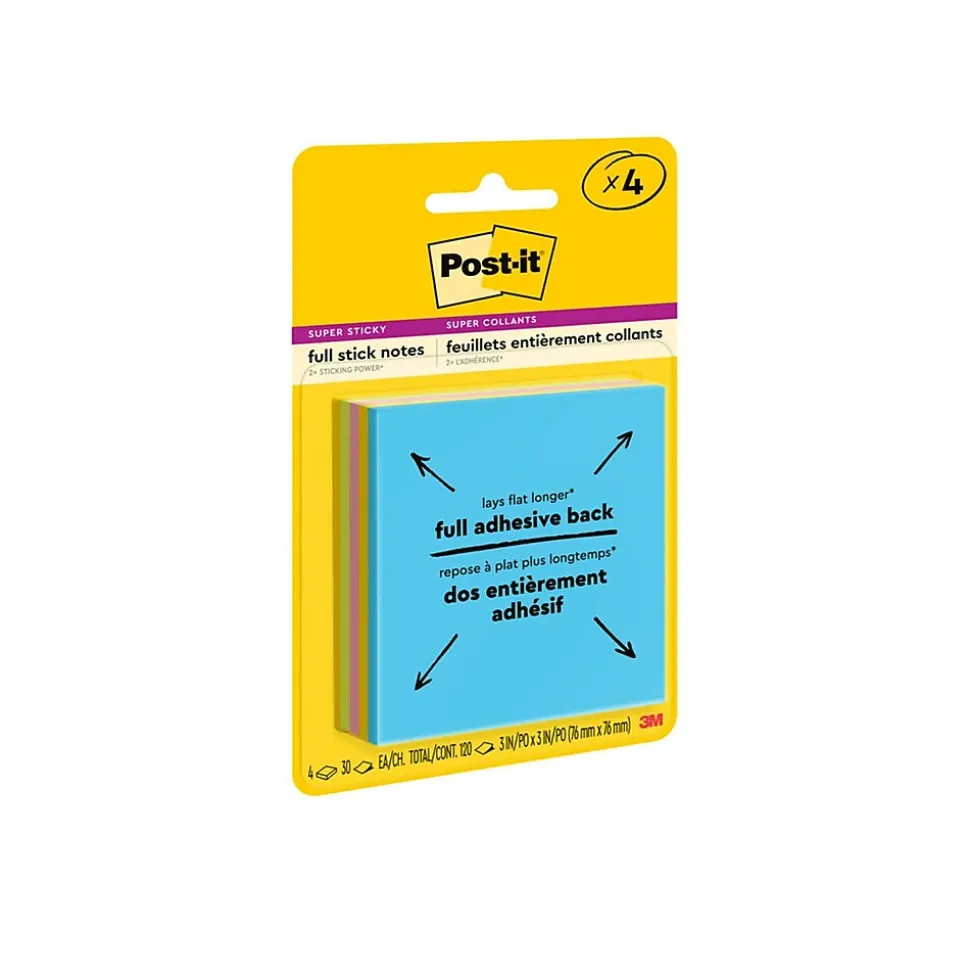 Post-it® Super Sticky Full Stick Notes lay flat longer to keep your message neat. 3 in. x 3 in. size is great for short lists or notes or reminders on doors, windows or walls. Note has full adhesive back and features a easy peel edge with indicator so you can peel a note with ease. Unique adhesive reliably sticks and re-sticks so your message can stay front and center. Move your notes with you throughout the day. Bright colors from the Energy Boost collection help your note stand out. Pad sticks in a notebook or on a laptop, so you always have a note at the ready. Post-it® Super Sticky Full Stick Notes are recyclable and the paper is sourced from certified, renewable and responsibly managed forests. 4 Pads/Pack, 30 Sheets/Pad.